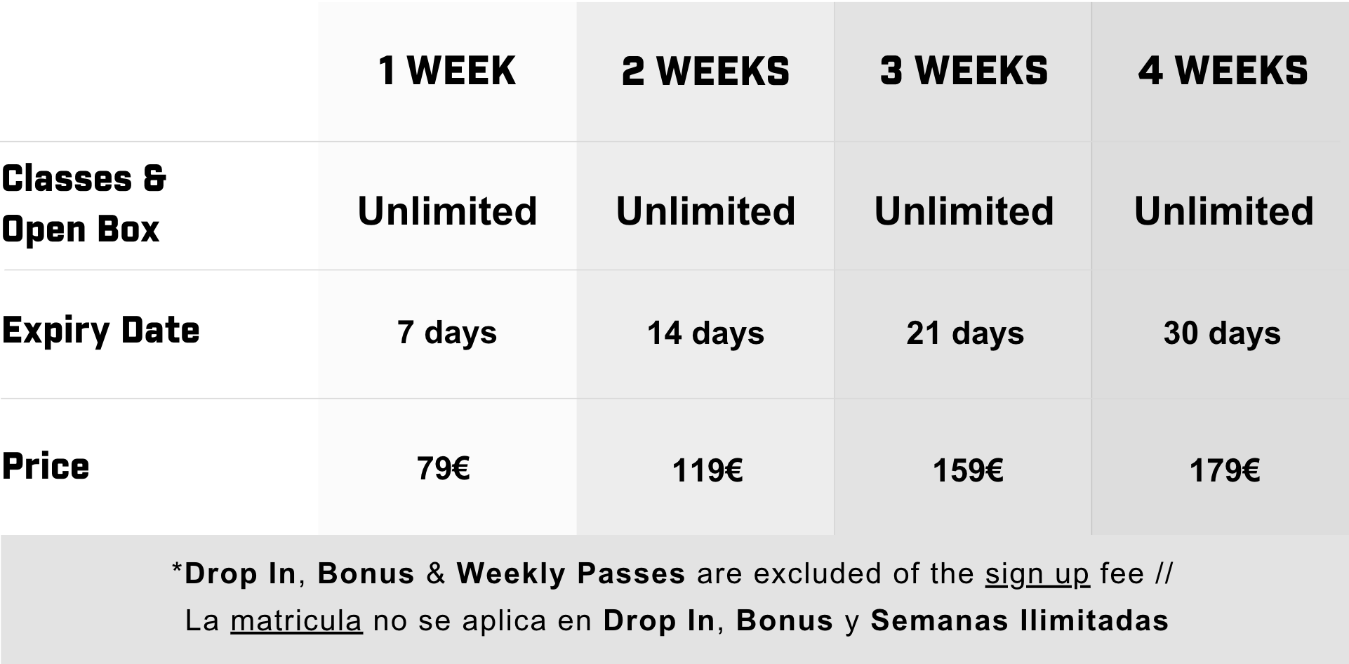 **Weekly Unlimited Pass days start counting on the day of purchase // Los días de los pases ilimitadas empiezan en el día de la compra